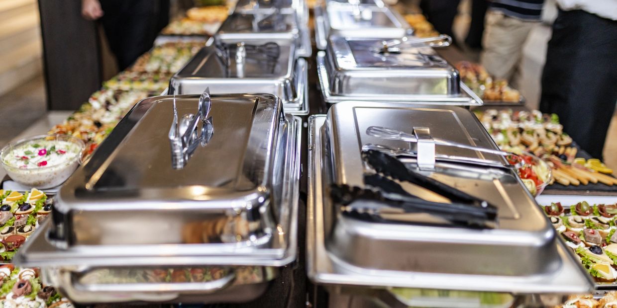 Our store space can fit up to 50 people comfortably. We supply tables, chairs, and buffet setup including chaffers, sternos and serving utensils.